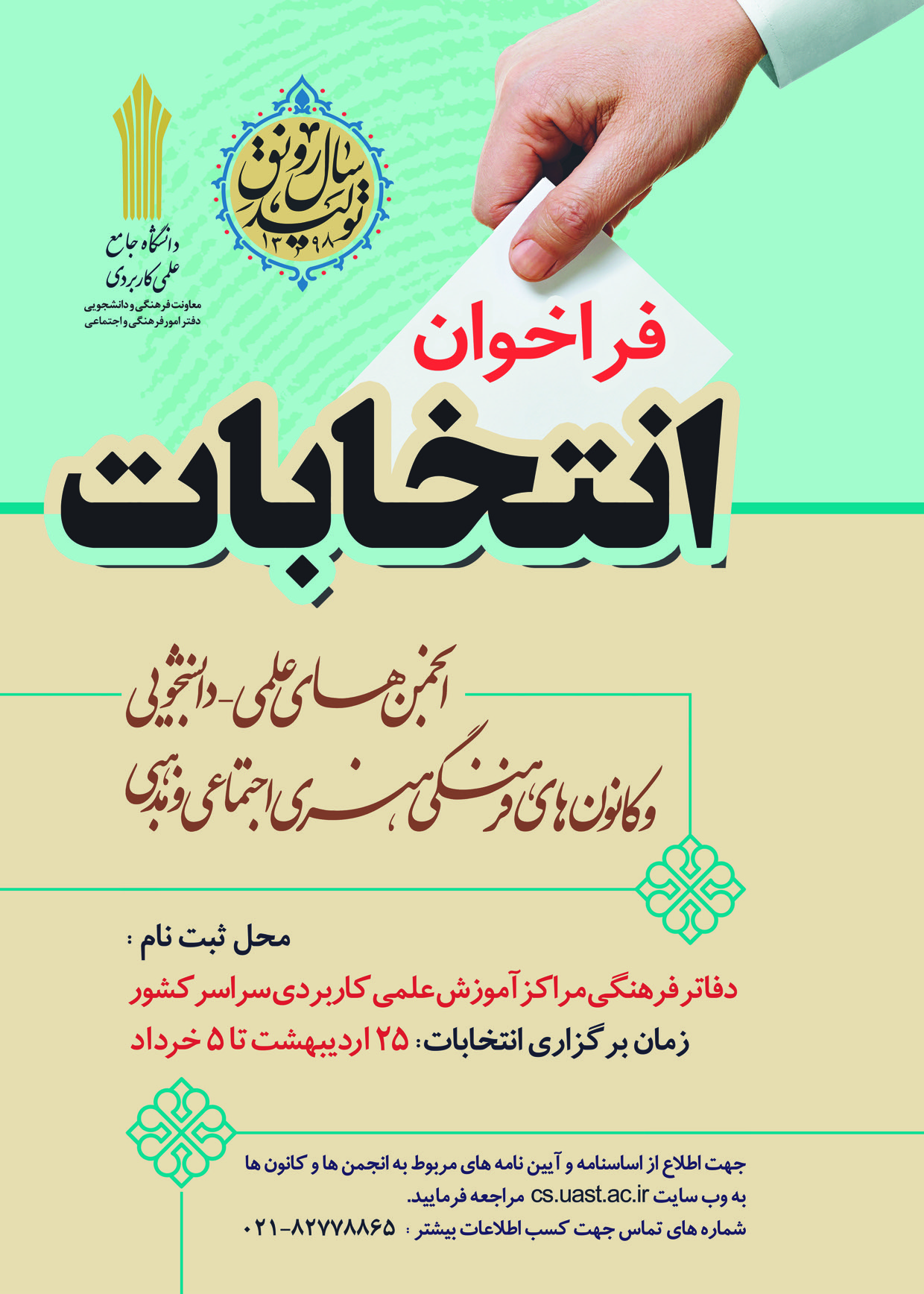 فراخوان انتخابات انجمن های علمی دانشجویی و کانونهای فرهنگی هنری اجتماعی و مذهبی مراکز آموزش علمی کاربردی برگزار می شود.