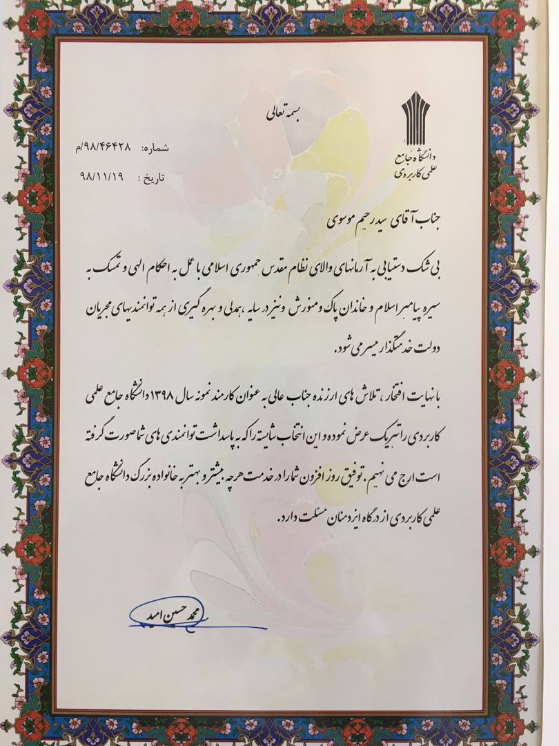 در این نشست از زحمات آقای سید رحیم موسوی مشاور و مدیر حراست دانشگاه جامع علمی کاربردی استان خوزستان به عنوان کارمند نمونه تقدیر بعمل آمد.