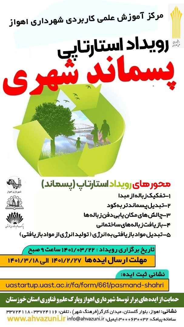 به گزارش روابط عمومی مرکز آموزش علمی کاربردی شهرداری اهواز رویداد استارتاپی پسماند شهری در مرکز آموزش علمی کاربردی شهرداری اهواز برگزار می گردد .